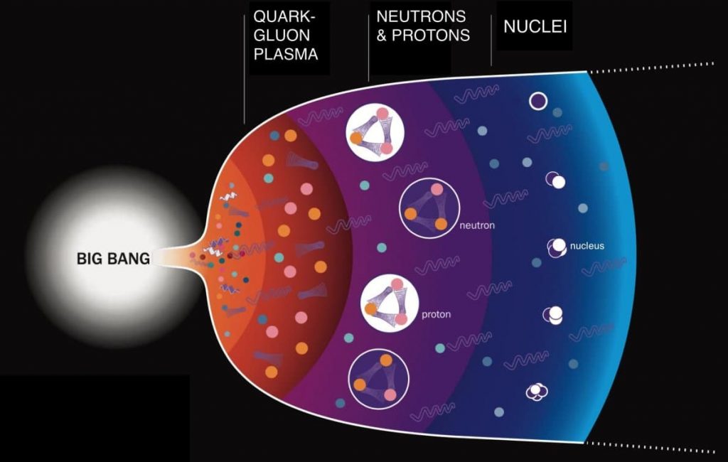 ២. បណ្តុំរូបធាតុ Quark-Gluon Plasma (QGP) បានបង្ហាញវត្តមាននៅកំឡុងពេល ០.០០០០០១ វិនាទី បន្ទាប់ពីបន្ទុះ Big Bang ហើយបន្ទាប់មកទៀតពួកវាក៏អវត្តមានទៅវិញ ព្រោះតែការពង្រីកខ្លួន