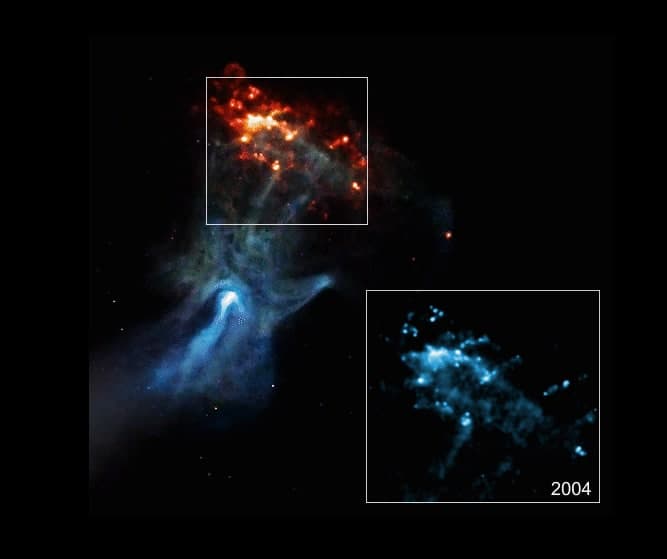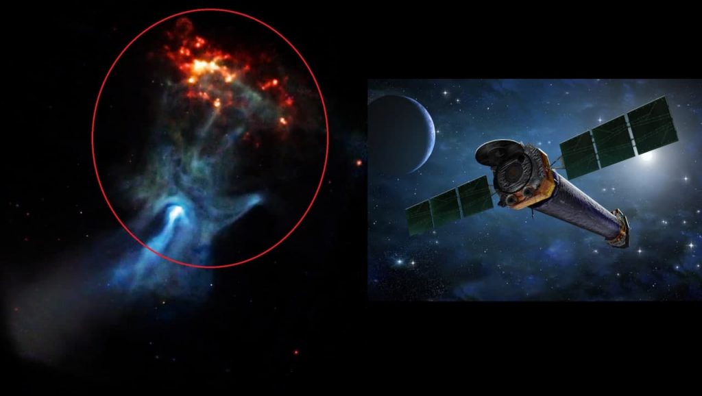 (បរទេស)៖ ក្រុមតារាវិទូនៃអង្គការ NASA បានប្រើប្រាស់រយៈពេល ១៤ឆ្នាំ ដើម្បីបញ្ជាតេឡេស្កូបអវកាស Chandra X-ray Observatory ឲ្យផ្តិតយកបាតុភូតក្រោយបន្ទុះស៊ូពើណូវ៉ា (supernova) មួយ ដែលមើលទៅហាក់មានរូបរាងដូចជា «បាតដៃភ្លើង» ដ៏ធំមហិមាកំពុងអណ្តែតក្នុងទីអវកាស នៅក្នុងល្បឿនរហូតដល់ជាង ១៥លានគីឡូម៉ែត្រនៅក្នុងមួយម៉ោងឯណោះ។