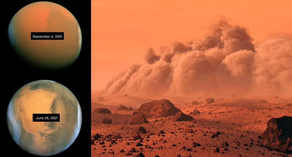 ព្យុះធូលីនៅភពអង្គារ អាចលាតសន្ធឹងទូទាំងភពទាំងមូល ហើយគ្របដណ្តប់វាជាមួយភាពងងឹត។ ជាយូរណាស់មកហើយ អ្នកវិទ្យាសាស្រ្តបានដឹងថា ព្យុះយក្សធំៗសម្បើមទាំងនេះ គឺជាមូលហេតុដែលធ្វើឲ្យទឹកត្រូវបាត់បង់ពីលើផ្ទៃភពអង្គារ។ យ៉ាងណាក្តី ភពអង្គារធ្លាប់ជាភពដែលស្រដៀងនឹងភពផែនដី គឺមានមហាសមុទ្រជាដើម ហើយព្យុះធំៗទាំងនោះ មិនអាចផ្តល់ការបកស្រាយឲ្យបានច្បាស់ អំពីការបាត់បង់ទឹកទាំស្រុងរបស់ភពអង្គារឡើយ។