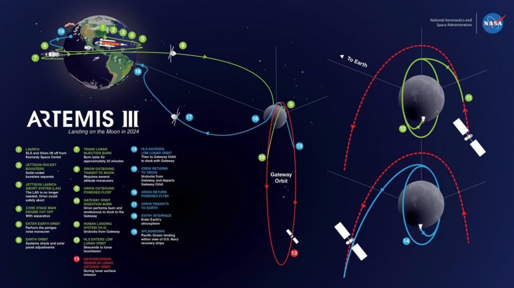 សម្រាប់បេសកកម្ម Artemis 1 ទីភ្នាក់ងារអវកាស NASA នឹងបញ្ជូនយានគ្មានមនុស្សជិះ ឲ្យទៅធ្វើដំណើរសាកល្បងជុំវិញព្រះចន្ទ រួចត្រឡប់មកផែនដីវិញ។ បេសកកម្មនោះត្រូវបានគេរំពឹងថា នឹងធ្វើឡើងនៅខែកុម្ភៈ ឆ្នាំ២០២២។ សម្រាប់គម្រោងបេសកកម្មបន្ទាប់គឺ Artemis 2 យានមានផ្ទុកអវកាសយានិកចំនួនម្នាក់ នឹងធ្វើដំណើរទៅក្រឡឹងជុំវិញព្រះចន្ទ នៅឆ្នាំ២០៣៣។ ក្រោយមកបេសកកម្ម Artemis 3 នឹងជាការបញ្ជូនក្រុមអវកាសយានិក ឲ្យទៅចុះចតលើផ្ទៃព្រះចន្ទ នៅតំបន់ប៉ូលខាងត្បូងរបស់វា។