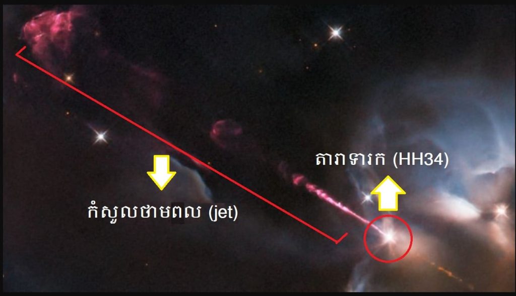 បើតាមការពណ៌នារបស់អង្គការអវកាសអឺរ៉ុប ESA, កំសួលថាមពល (jet) ខាងលើនេះ គឺមានពណ៌ចំរុះគួរឲ្យគយគន់ និងបង្ហាញអំពីថាមពលដ៏អស្ចារ្យ ដែលតារាកំពុងចាប់កំណើតដ៏កញ្ជ្រោលមួយ អាចបាញ់ចេញទៅកាន់ទីអវកាស នៅជុំវិញខ្លួនវា។ តំបន់ដែលតារាមួយទើបចាប់កំណើតនេះ ត្រូវបានដាក់ឈ្មោះសម្គាល់ថា HH34 ហើយវាត្រូវបាន Hubble ក្រឡេកឃើញលើកដំបូងកាលពីអំឡុងឆ្នាំ ១៩៩៤ ដល់ឆ្នាំ ២០០៧ (នៅពេលដែល Hubble កំពុងធ្វើតេស្តកាមេរ៉ា) និងការអង្កេតលម្អិតតែម្តងនៅឆ្នាំ ២០១៥។