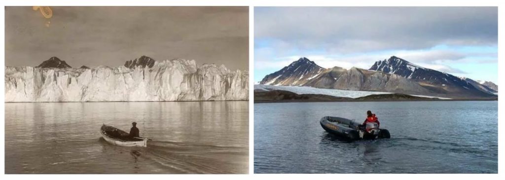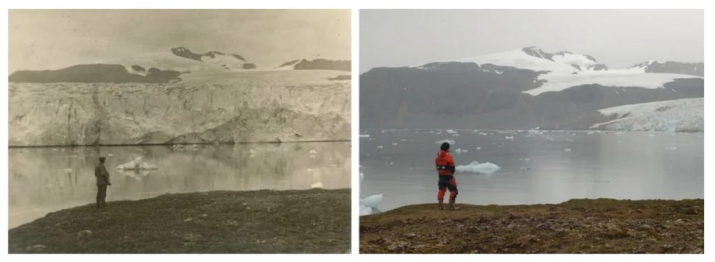២៖ (រូបមនុស្សឈរ) នេះក៏ជាការប្រៀបធៀបដែលមិនសូវខុសពីរូបទី ១ ប៉ុន្មាននោះដែរ គ្រាន់តែស្ថិតនៅជ្រុងផ្សេងពីគ្នាតែប៉ុណ្ណោះ នៅតំបន់មហាសមុទ្រទឹកកកអាកទិក។ រយៈពេល ១០០ឆ្នាំមុន និង ១០០ឆ្នាំក្រោយ ផ្ទាំងទឹកកកនៅក្នុងរូបភាពចាស់បានបាត់ស្ទើរអស់រលីង ខណៈទាំងរូបចាស់ និងរូបថ្មី ដែលត្រូវបានដាក់ទន្ទឹមគ្នានេះ សុទ្ធតែត្រូវបាននៅអំលុងរដូវក្តៅ៕
