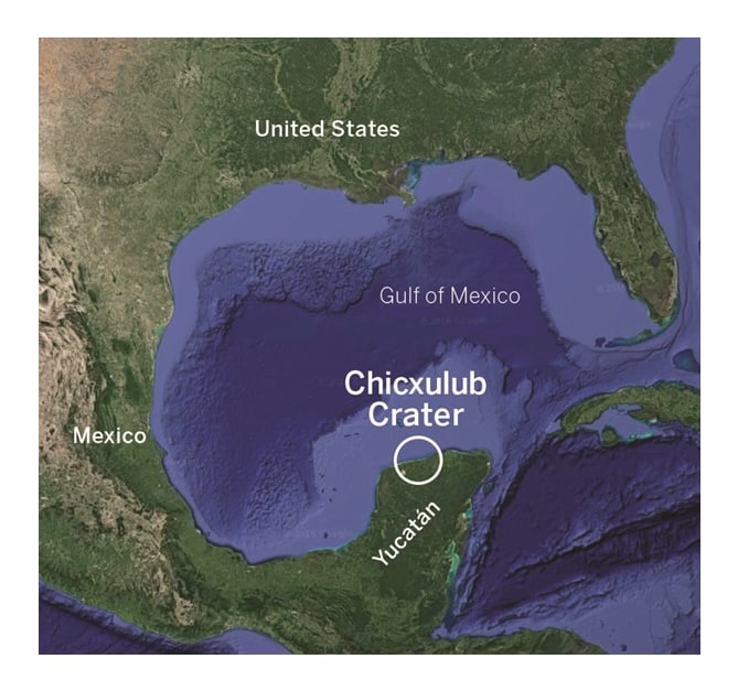 ដោយឡែកអាចម៍ផ្កាយ Chicxulub ដែលបានធ្លាក់លើភពផែនដី កាលពី ៦៦លានឆ្នាំមុនវិញនោះ គឺបានធ្វើឲ្យឧបទ្វីប យូកាតាន់ (Yucatan) នៃប្រទេសម៉ិចស៊ីកូ កើតមានរណ្តៅដែលមានអង្កត់ផ្ចិត ១៨០គីឡូម៉ែត្រ និងបិទបញ្ចប់សម័យកាល Cretaceous (សម័យកាលដាយណូស័រ) ជាស្ថាពរតែម្តង (សម័យកាលដាយណូស័រដើរដី មានអាយុកាលសរុប ១៦៥លានឆ្នាំ)។