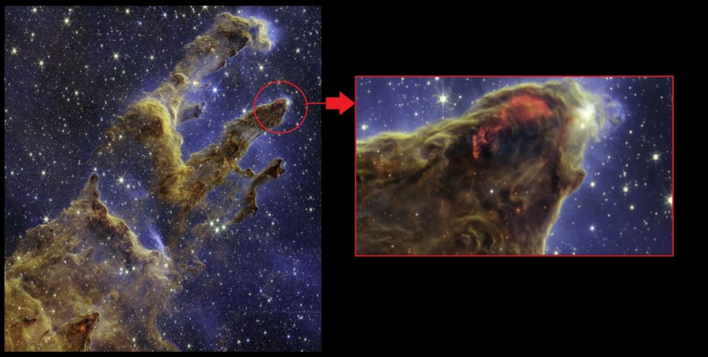 ហេតុអ្វីរូបភាព The Pillars of Creation ថតដោយ James Webb ពិសេសខ្លាំងម្ល៉េះ? តាមរយៈសមត្ថភាពនៃឧបករណ៍ចាប់យកពន្លឺក្រហមអាំងហ្វ្រា (Infared Light) របស់ James Webb បានធ្វើឲ្យតេឡេស្កូបអវកាសមួយនេះចាប់បាន តំបន់កកើតផ្កាយដ៏កញ្ជ្រោល នៅក្នុងផ្នែកមួយចំនួននៃបណ្តុំពពកធូលីដ៏ល្បីល្បាញឈ្មោះ «The Pillars of Creation» ឬ «សសរស្តម្ភទាំង ៣ នៃការបង្កើត»។