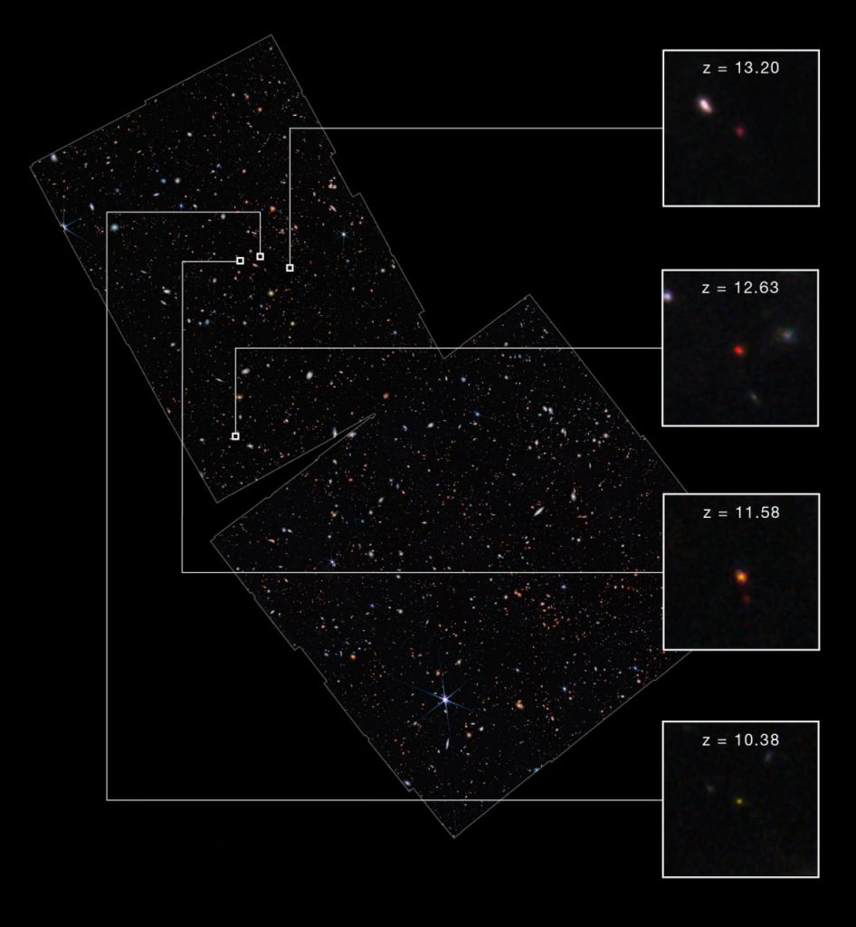 នៅក្នុងការវែករកមើលរូបភាពថតដោយ James Webb នោះ ក្រុមតារាវិទូបានប្រទះឃើញកាឡាក់ស៊ីចំនួន ៤ ដូចជា៖ z = 13.20 , z = 12.63 , z = 11.58 និង z = 10.38។ សម្រាប់អាយុកាលក្រោម ៤០០លានឆ្នាំបន្ទាប់ពី Big Bang នេះមានន័យថា ពន្លឺរបស់កាឡាក់ស៊ីទាំង ៤ នេះត្រូវការពេលរហូតដល់ជាង ១៣.៤ពាន់លានឆ្នាំ ទើបអាចមកដល់ភពផែនដីយើង។