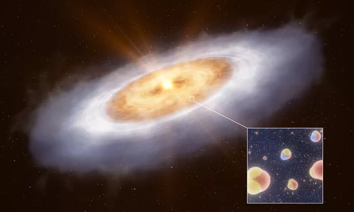 តាមដំណើរការខាងលើនេះថា ផ្កាយជាទូទៅចាប់កំណើតនៅក្នុង បណ្តុំពពកធូលី និងឧស្ម័នដ៏ធំសម្បើម ដែលដួលរលំបន្តិចម្តងៗ និងកាន់តែក្តៅគគុកឡើង នៅក្នុងដំណើរការរួមផ្សំគ្នានោះ។ នៅពេលដែលផ្កាយទារក (protostar) មួយកំពុងប្រសូត្រចេញរូបរាងទៅហើយនោះ កម្ទេចធូលី និងឧស្ម័នដែលបន្សល់ទុក ពីការបង្កើតផ្កាយនោះ ក៏ក្លាយទៅជាបន្ទះឌីស (disks) ធូលី និងឧស្ម័នព័ទ្ធជុំវិញផ្កាយនោះ ដោយខ្លះនៅជិតៗក៏បន្តត្រូវផ្កាយស្រូបចូល ដើម្បីបង្កើនមាឌបន្តិចម្តងៗ និងខ្លះទៀតស្ថិតនៅឆ្ងាយ ក៏ប្រមូលផ្តុំក្លាយជាភព ផ្កាយដុះកន្ទុយ និងអាចម៍ផ្កាយជាដើម។ នៅពេលដែលភពមួយត្រូវបានបង្កើតឡើង ទឹកមកពីបន្ទះឌីសនៅជុំវិញភពនោះ (ដែលកំពុងកកក្នុងផ្កាយដុះកន្ទុយរាប់លានដុំ) ក៏ធ្លាក់ស្រោចទៅលើភពនោះតែម្តង។