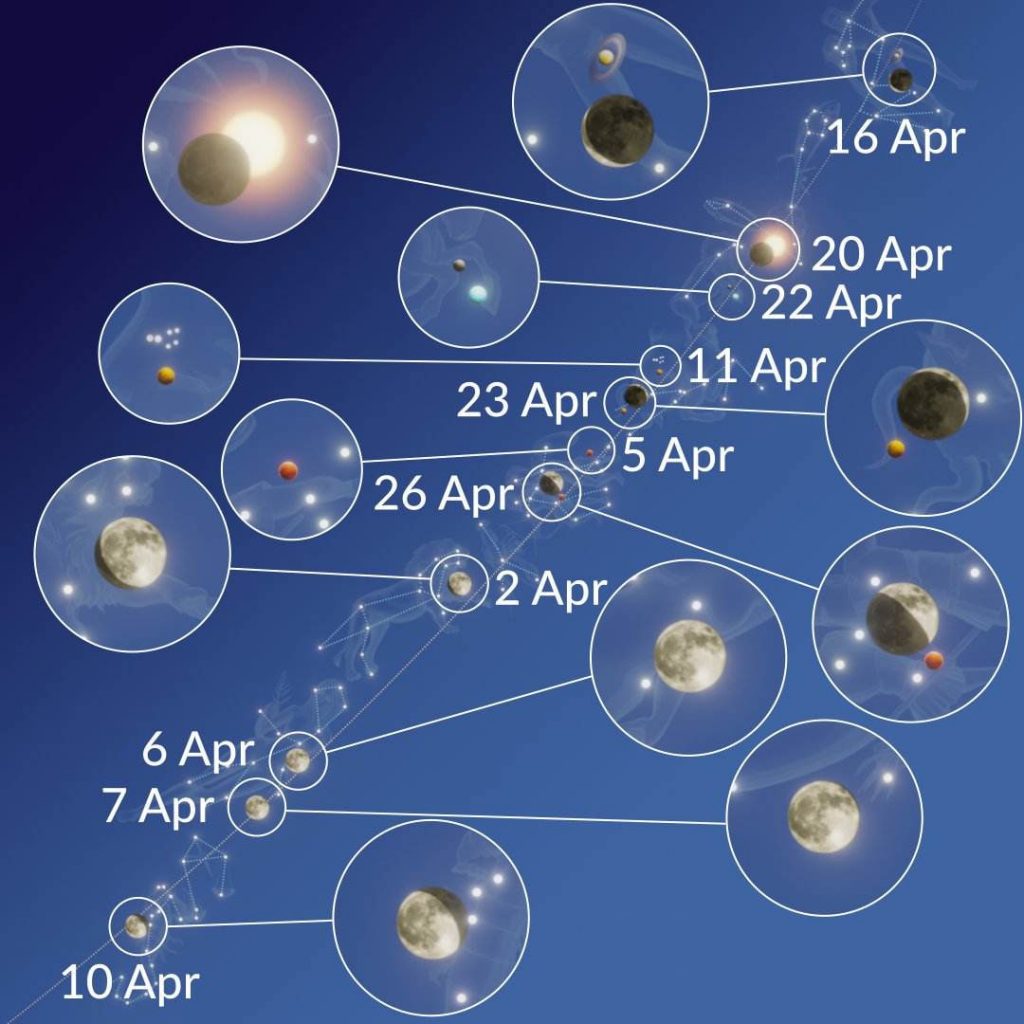 អ្វីដែលកាន់តែពិសេសនោះ នៅល្ងាចថ្ងៃទី ៩ – ១០ ខែមេសា ឆ្នាំ២០២៣ កញ្ចុំផ្កាយកូនមាន់ និងភពសុក្រ នឹងមានឱកាសរំកិលមកកៀកគ្នាលើផ្ទៃមេឃភពផែនដី នៅពេលយប់ងងឹតខ្លាំង។ ទិដ្ឋភាពដូចបានរៀបរាប់ទាំងអស់នេះ សុទ្ធតែអាចឲ្យយើងមើលឃើញដោយភ្នែកទទេបាន ហើយបើមានកាមេរ៉ាល្អចាំផ្តិតយករូបភាពទៀតនោះ នឹងកាន់តែប្រសើរបំផុត។ ខាងក្រោមនេះជារូបភាពរបស់វែបសាយ StarWalk ដែលបង្ហាញពីព្រឹត្តិការណ៍សំខាន់ៗបន្ថែម សម្រាប់ខែមេសា ឆ្នាំ២០២៣នេះ៖