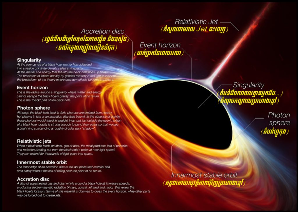 តំបន់នៅជុំវិញ Singularity នោះហើយគឺជាមាត់ច្រកនៃពេលវេលា (Event Horizon) ដែលមិនមាន រូបរាង ឬ ព្រំដែនជាក់លាក់នោះឡើយ តែវាជាច្រកព្រំដែនធម្មតាមួយ នៅជុំវិញចំណុច Singularity (ជាតំបន់ខ្មៅងងឹតចំកណ្តាល Black Hole) ដែលប្រកបដោយកម្លាំងទំនាញខ្លាំងមហាសាលបំផុត ដោយសូម្បីតែពន្លឺក៏មិនអាចគេចផុតពីទីនោះដែរ។ ទស្សនាវីដេអូខាងក្រោម ដើម្បីយល់ដឹងលម្អិតតែម្តងអំពី Black Hole៖