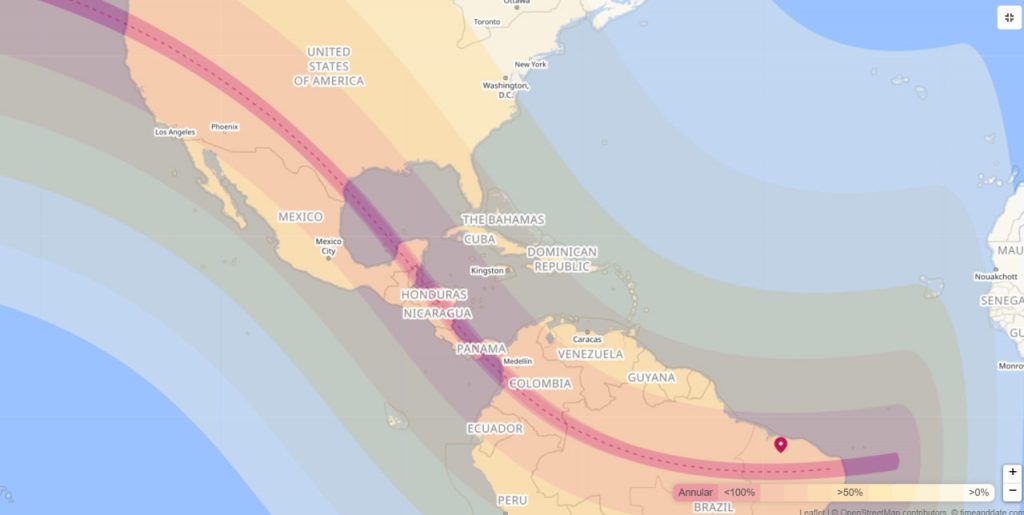 (អាមេរិក)៖ បាតុភូតសូរ្យគ្រាសចិញ្ចៀនភ្លើង ឬកងភ្លើង (Annular Solar Eclipse ឬ Eclipse Ring of Fire) នឹងកើតឡើងពីលើតំបន់អាមេរិកខាងជើង អាមេរិកកណ្តាល និងអាមេរិកខាងត្បូង នៅព្រឹកថ្ងៃទី១៤ ខែតុលា ឆ្នាំ២០២៣ (ម៉ោងនៅសហរដ្ឋអាមេរិក) ត្រូវនឹងពាក់កណ្តាលយប់ថ្ងៃដដែល (ម៉ោងនៅប្រទេសកម្ពុជា)។