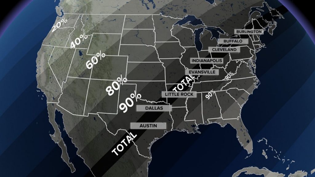 សម្រាប់រដ្ឋទាំង ១៥ នៅសហរដ្ឋអាមេរិកនោះ បាតុភូតសូរ្យគ្រាសពេញនឹងអូសកាត់ចាប់ពីរដ្ឋ Texas នៅភាគខាងត្បូងប្រទេស ឡើងទៅរដ្ឋ Arkansas, Oklahoma, Missouri, Tennessee, Illinois, Kentucky, Indiana, Ohio, Michigan, Pennsylvania, New York, Vermont, New Hampshire និងចុងក្រោយគេគឺរដ្ឋ Maine ដែលស្ថិតនៅចុងភាគឦសានសហរដ្ឋអាមេរិកតែម្តង។