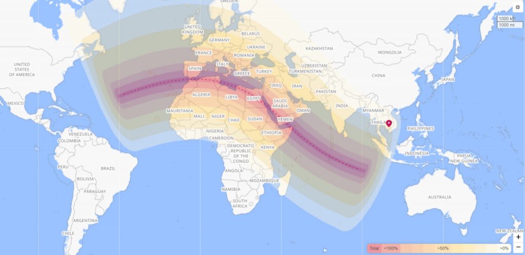 យោងតាមផែនទីសូរ្យគ្រាសពីវែបសាយ Time and Date សូរ្យគ្រាសកងភ្លើង (Annular Solar Eclipse) ក្នុងកម្រិតពេញលេញ នឹងអូសកាត់ដំបូងគេលើប្រទេស អង់ហ្គោឡា, ហ្សាំប៊ី និងតង់ហ្សានី (នៅតំបន់អាហ្វិក) រួចក៏អូសកាត់ដែនសមុទ្រ អារ៉ាប់ (Arabian Sea) នៃមហាសមុទ្រឥណ្ឌា, ភាគខាងត្បូងប្រទេសឥណ្ឌា និងភាគខាងជើងប្រទេសស្រីលង្ហា (នៃតំបន់អាស៊ីខាងត្បូង)។