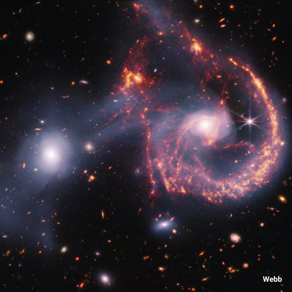 ងាកមកកាន់រូបភាពមួយសន្លឹករបស់ James Webb វិញ គឺស្ថិតនៅក្នុងទម្រង់ជា infrared light ឬជាពន្លឺក្រហមអាំងហ្វ្រា ដែលភ្នែកមនុស្សមិនអាចមើលឃើញឡើយ។ នៅក្នុងទម្រង់បែបនេះ ក្រុមតារាវិទូអាចមើលឃើញវត្តមាននៃស្ពានចម្លង (តំបន់ចន្លោះកាឡាក់ស៊ីទាំង២ ដែលកំពុងផ្សាភ្ជាប់គ្នា) ព្រមទាំងតំបន់កកើតផ្កាយនានា និងធូលី ដែលពោពេញដោយម៉ូលេគុលអូកានិចពណ៌ខ្មៅមានឈ្មោះពេញថា ប៉ូលីស៊ីគ្លិច អារ៉ូម៉ាទិច អ៊ីដ្រូកាបូន (polycyclic aromatic hydrocarbons) (តំបន់មានពណ៌ក្រហម និងទឹកក្រូច)។