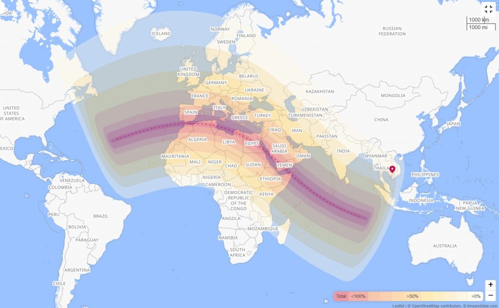 ប្រិយមិត្តអាចទស្សនាការ Live តាមរយៈ Facebook និង YouTube នៅក្នុងពេលនោះបាន ដោយបណ្តាប្រទេសដែលនឹងត្រូវសូរ្យគ្រាសពេញលេញអូសចំតែម្តងនោះគឺ ភាគខាងត្បូងអេស្ប៉ាញ, ភាគខាងជើងម៉ូរ៉ូកូ, ដែនដីជីប្រាល់តា (អង់គ្លេស), ភាគខាងជើងអាល់ហ្សេរី, ទុយនីស៊ីស្ទើរទាំងមូល, ភាគខាងជើងលីប៊ី, ភាគកណ្តាលអេហ្ស៊ីប, ផ្នែកខ្លះនៃអារ៉ាប៊ីសាអូឌីត, យ៉េមែន, សូម៉ាលី និងដែនកោះរបស់អង់គ្លេស នៅក្បែរម៉ាល់ឌីវ។