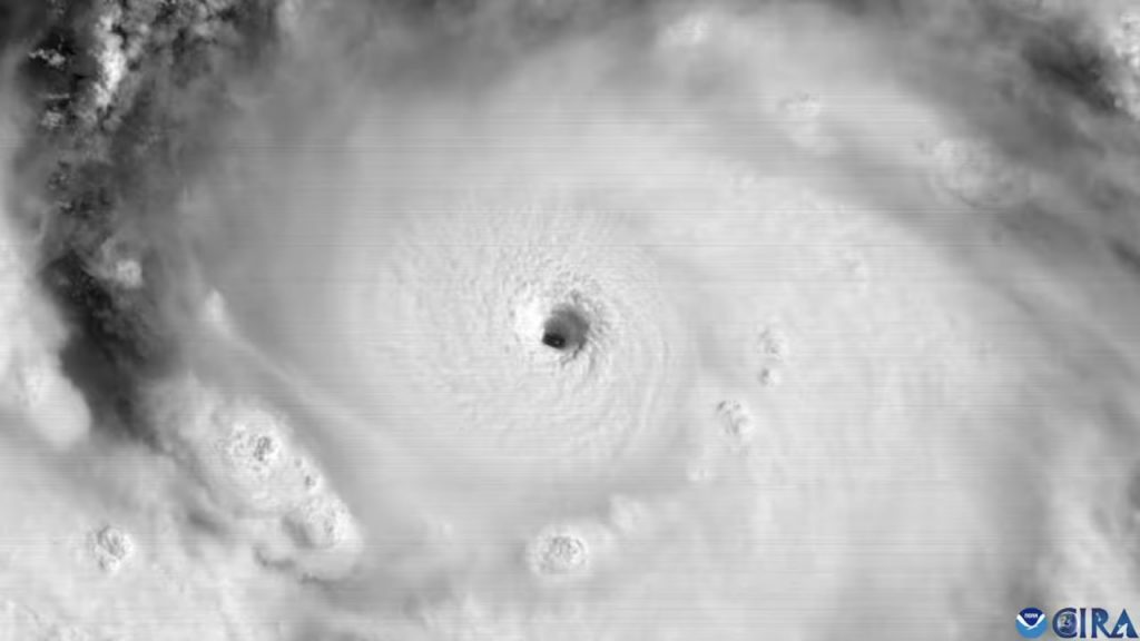 សម្រាប់ទិដ្ឋភាពព្យុះហឺរីខិន Erin ដែលត្រូវបានផ្តិតដោយផ្កាយរណប GOES-19 គឺនៅពេលដែលវាលោតចូលដល់កម្រិតទី ៤ នៃកម្លាំងបោកបក់ទៅហើយ ខណៈកំពុងឆ្ពោះទៅរកភាគខាងកើតនៃសមុទ្រ Caribbean។ យើងអាចឃើញដំណើរពង្រីកឥទ្ធិពលរបស់ Erin ចាប់តាំងពីការនៅត្រឹមជាបណ្តុំពពកកួច រហូតក្លាយទៅព្យុះពេញរូបរាង ដោយយើងឃើញភ្នែករបស់វាព្រមទាំងរចនាសម្ព័ន្ធច្បាស់លាស់ដែលបញ្ជាក់ថាវាគឺជាហឺរីខិនកំណាច។
