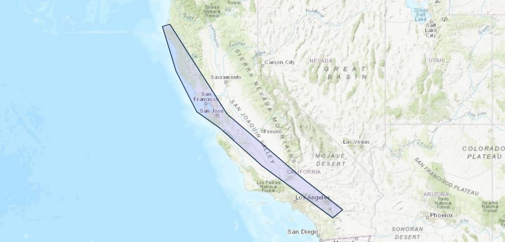 គួរបញ្ជាក់ថា តំបន់ប្រេះស្រាំស្រទាប់ផែនដី San Andreas Fault លាតសន្ធឹងប្រវែង ១,២០០km ពីតំបន់សមុទ្រ Salton Sea នៃភាគខាងត្បូងរដ្ឋកាលីហ្វ័រញ៉ា ទៅកាន់ភាគខាងជើងដែលជាប់នឹងឆ្នេរសមុទ្រនៃតំបន់ Mendocino នៃរដ្ឋកាលីហ្វ័រញ៉ា។ កាលពីឆ្នាំ១៩០៦ ការរំកិលផ្នែកខាងជើងនៃតំបន់នេះ បានបង្កឲ្យមានគ្រោះរញ្ជួយដីកម្រិតខ្លាំងរហូតដល់ទៅ ៧.៩ (magnitude) ដែលបានបណ្តាលឲ្យមនុស្សជាង ៣,០០០នាក់ឯណោះបាត់បង់ជីវិត, នេះបើតាមទិន្នន័យពីទីភ្នាក់ងារស្ទាបស្ទង់ភូគព្ភសាស្ត្រ នៃសហរដ្ឋអាមេរិក (USGS)។