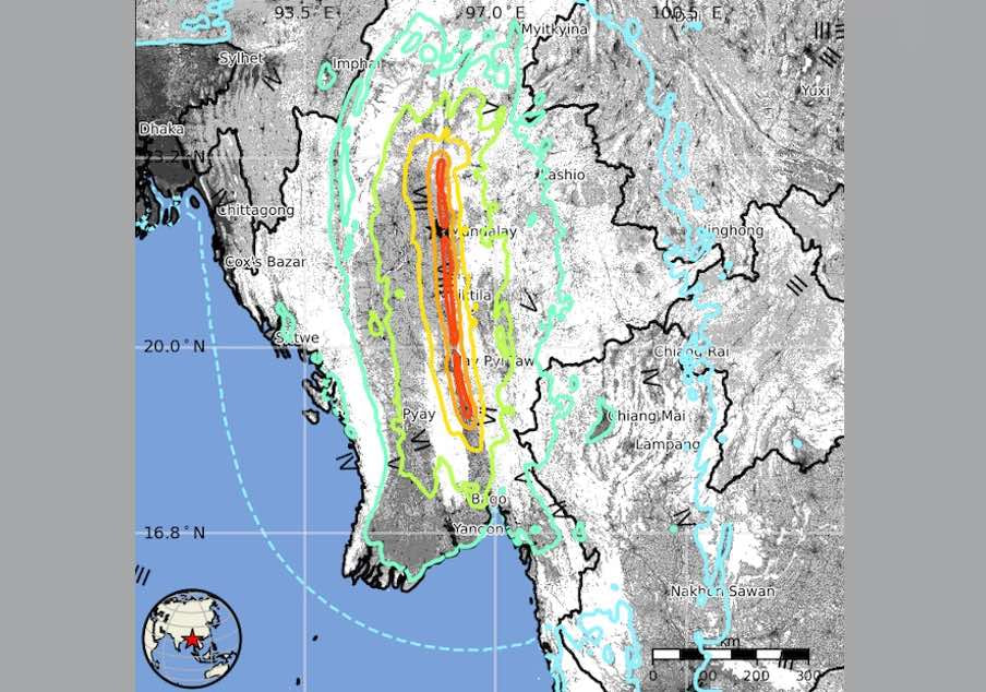 ងាកមកកាន់តំបន់ Sagaing Fault របស់មីយ៉ាន់ម៉ាវិញ ក្រុមអ្នកវិទ្យាសាស្ត្របានរំពឹងថា វានឹងរំកិលស្របទៅនឹងស្នាមប្រេះរបស់វាដែលមានស្រាប់ ដោយពួកគេបានកំណត់ទីតាំងជាក់លាក់ថា ការរំកិល (ញ័ររញ្ជួយដី) នឹងកើតឡើងនៅទូទាំងតំបន់មានស្នាមប្រេះស្រាំក្នុងបណ្តោយប្រវែង ៣០០km ដែលមិនធ្លាប់មានគ្រោះរញ្ជួយដីធ្ងន់ធ្ងរឡើយ គិតចាប់តាំងពីឆ្នាំ១៨៣៩។ ការព្យាករណ៍នេះ គឺផ្អែកទៅលើសម្មតិកម្មនៃគម្លាតគ្រោះរញ្ជួយដី ដែលបានកើតមានកាលពីអតីតកាល ទៅនឹងថេរវេលានៃការជាប់គាំងទ្រឹងមិនមានរញ្ជួយដីយូរមកហើយនៅតំបន់ Sagaing Fault នោះ ហើយវានឹងរំកិលទៅរកកន្លែងដែលវាត្រូវទៅ។