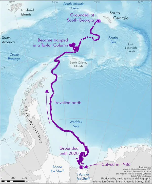 ជំនោរសមុទ្រដែលមានលក្ខណៈបញ្ច្រាស់ទ្រនិចនាឡិកាខាងលើនេះ មានចលនាពីកោះ South Georgia របស់អង់គ្លេស ស្ថិតនៅភាគខាងត្បូងមហាសមុទ្រអាត្លង់ទិច ដែលស្ថិតនៅក្បែរទ្វីបអង់តាកទិកផង និងទល់មុខច្រកសមុទ្រ Drake Passage ដែលជាច្រកសមុទ្រដ៏ចលាចល ខណ្ឌចែករវាងទ្វីបអាមេរិកខាងត្បូង និងអង់តាកទិកនោះផង។ កំសួលនៃចរន្តបែបនេះ អូសបន្លាយក្នុងពេលរាប់ខែចាប់ពីខែមីនា ដល់ខែឧសភា ឆ្នាំ២០២៥ ទំនងជាកត្តាដែលបានជំរុញឲ្យ A23a ប្រេះបែកជាបំណែកៗនៅពេលនេះ៕