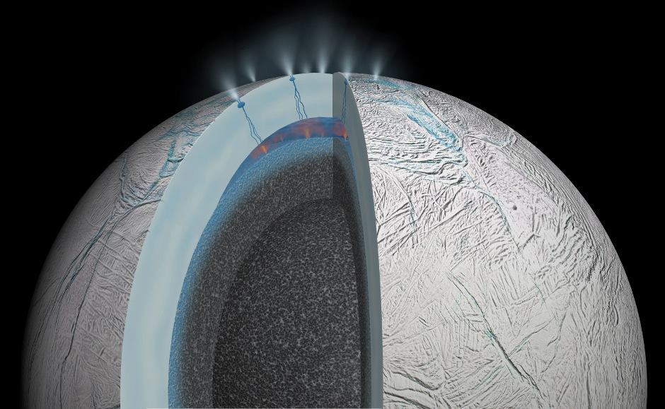ទឹកក្តៅផុសចេញពីដី ត្រូវបានប្រទះឃើញតាមរយៈ ការផ្ទុះភ្នំភ្លើងនៅលើផ្ទៃព្រះច័ន្ទទឹកកក អេនសេឡាដឹស របស់ភពសៅរ៍ ដែលនេះគឺជាភស្តុតាង ដ៏ជាក់លាក់មួយបញ្ជាក់ថា ព្រះច័ន្ទទឹកកកនេះ មានប្រភពទឹកនៅក្នុងផែនទឹកកកទាំងនោះ។